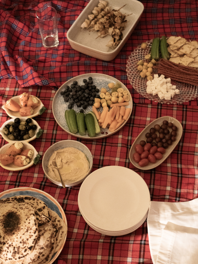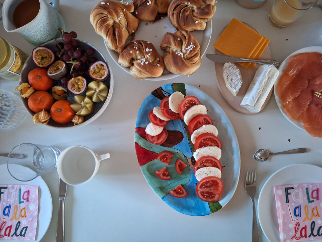 An Heiligabend gab es zum 1. Mal ein “Hirten-Picknick” unterm Weihnachtsbaum mit frischem Fladenbrot, Hähnchenspießen, Hummus, Oliven, Gemüse und Obst. Das war richtig lecker und gemütlich und hat Traditions-Potential!