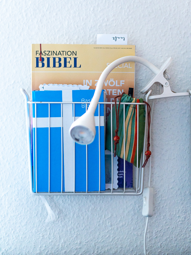 Ich finde es sehr praktisch und hilfreich, diesem Plan zu folgen, und bisher bin ich noch ganz motiviert dabei. Um die Routine zu unterstützen, habe ich das Sonderheft, die Bibel (präpariert mit vier Lesezeichen) und ein paar Stifte zum Markieren und Abhaken neben dem Sofa bereitgelegt. Eine neue Leselampe ist eine zusätzliche Hilfe – warum haben wir uns die nicht schon viel früher angeschafft?!