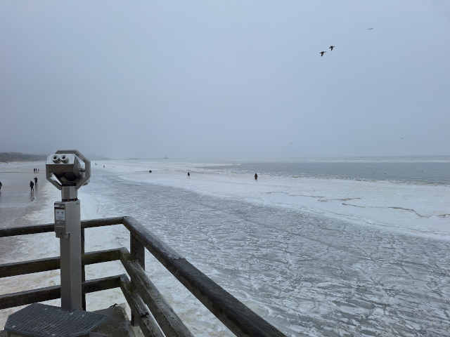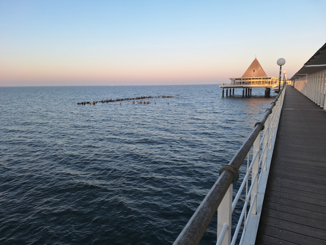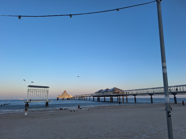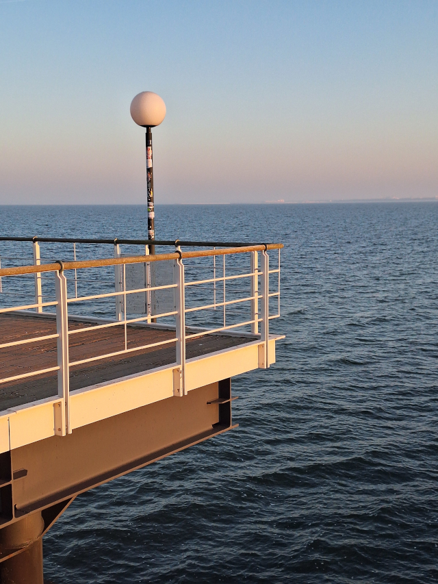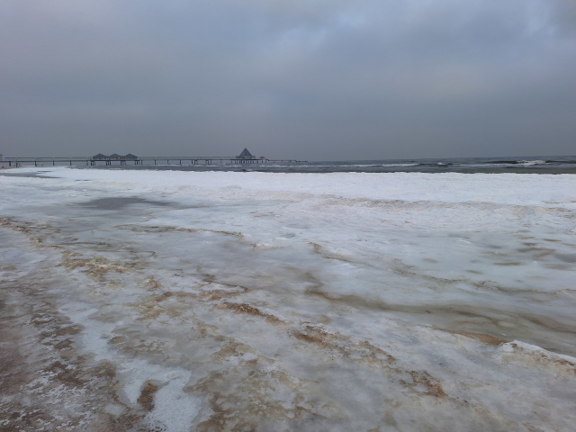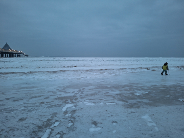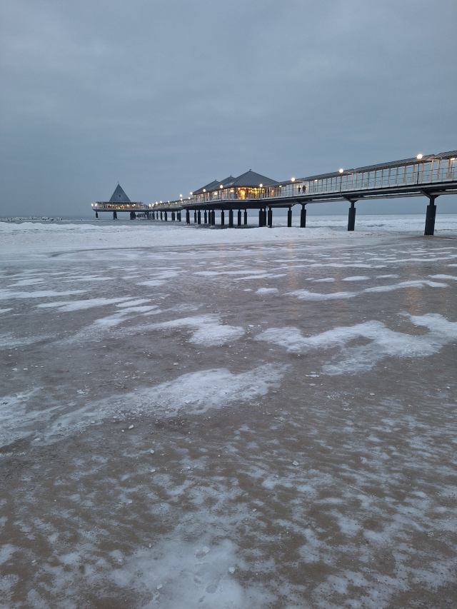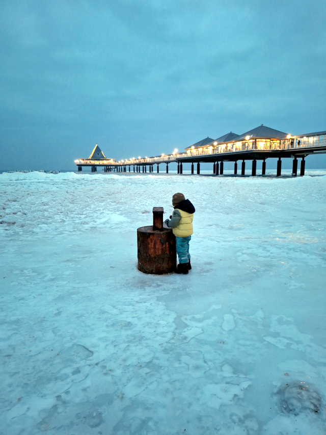 Auf Usedom und auf die Ostsee hatte ich mich mit am meisten gefreut – am Meer zu sein ist einfach so besonders, und ich liebe es schon immer! So führte uns unser erster Spaziergang nach dem Ankommen und Auspacken auch sofort an den Strand und die Seebrücke von Heringsdorf. An diesem ersten Abend erlebten wir die Ostsee auch – ohne es zu wissen – zum letzten Mal komplett eisfrei und begleitet vom vertrauten Wellenrauschen. In den nächsten Tagen konnten wir beobachten, wie das Meer immer weiter zufror. Die Eisbarriere wuchs und irgendwann war es am Strand so glatt, dass wir kaum noch Spazierengehen konnten – es war eine einzige schlidderige Rutschpartie.