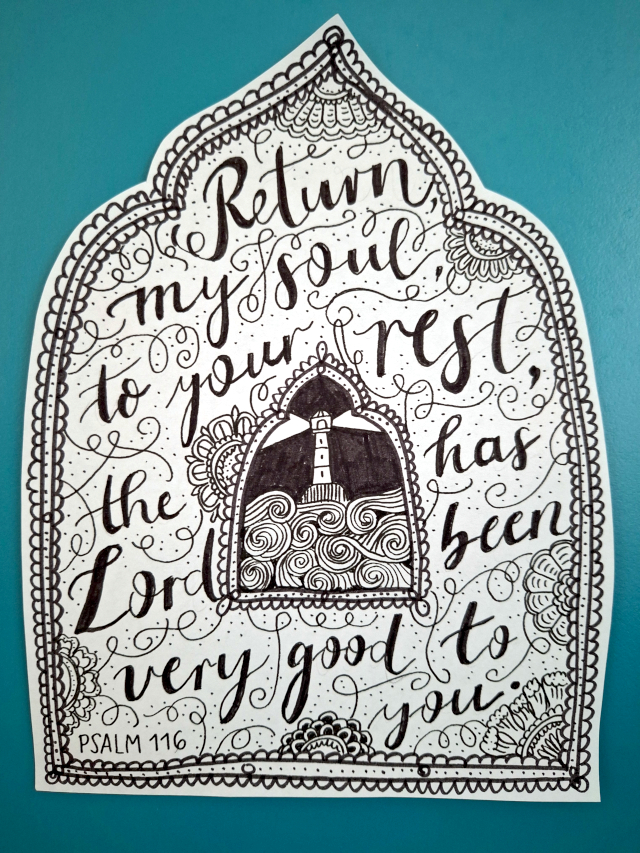 Und schließlich habe ich noch einen Bibelvers von der Kur mit nach Hause genommen, der mich etwa ab Mitte der Zeit sehr ermutigt und geprägt hat, sodass ich ihn auch künstlerisch umgesetzt habe: “Return, my soul, to your rest, the Lord has been very good to you.” (aus Psalm 116)