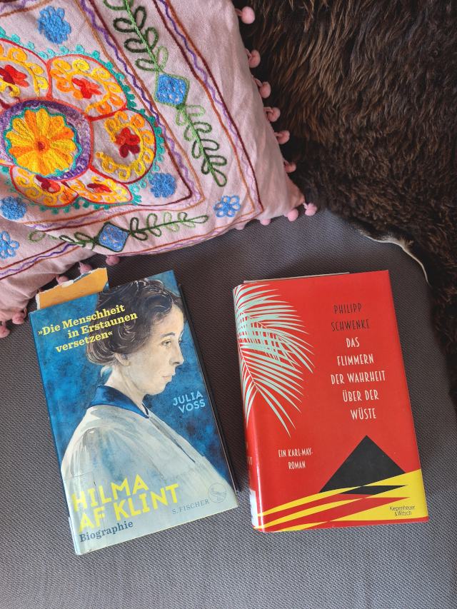 Zu den Dingen, die ich in den letzten Monaten als Lehrerin an der Schule noch auskosten möchte, gehört mein kostenloser Bibliotheksausweis – und so war ich am Freitagabend noch kurz vor Schließung der Bücherei mit meiner großen Tochter dort (quality time!), um ausgelesene Bücher zurückzubringen und natürlich neuen Lesestoff mit nach Hause zu nehmen! Dieses Mal habe ich mich für zwei Biographien entschieden: Eine über die schwedische Künstlerin Hilma af Klint, von der ich vor Kurzem zum ersten Mal gehört habe, und eine über Karl May, dessen Bücher mich in meiner Kindheit ein Stück begleitet haben. Wie toll, dass es Bücher gibt, und die Möglichkeit, sie lesen zu können, ohne sie gleich kaufen zu müssen 🙂